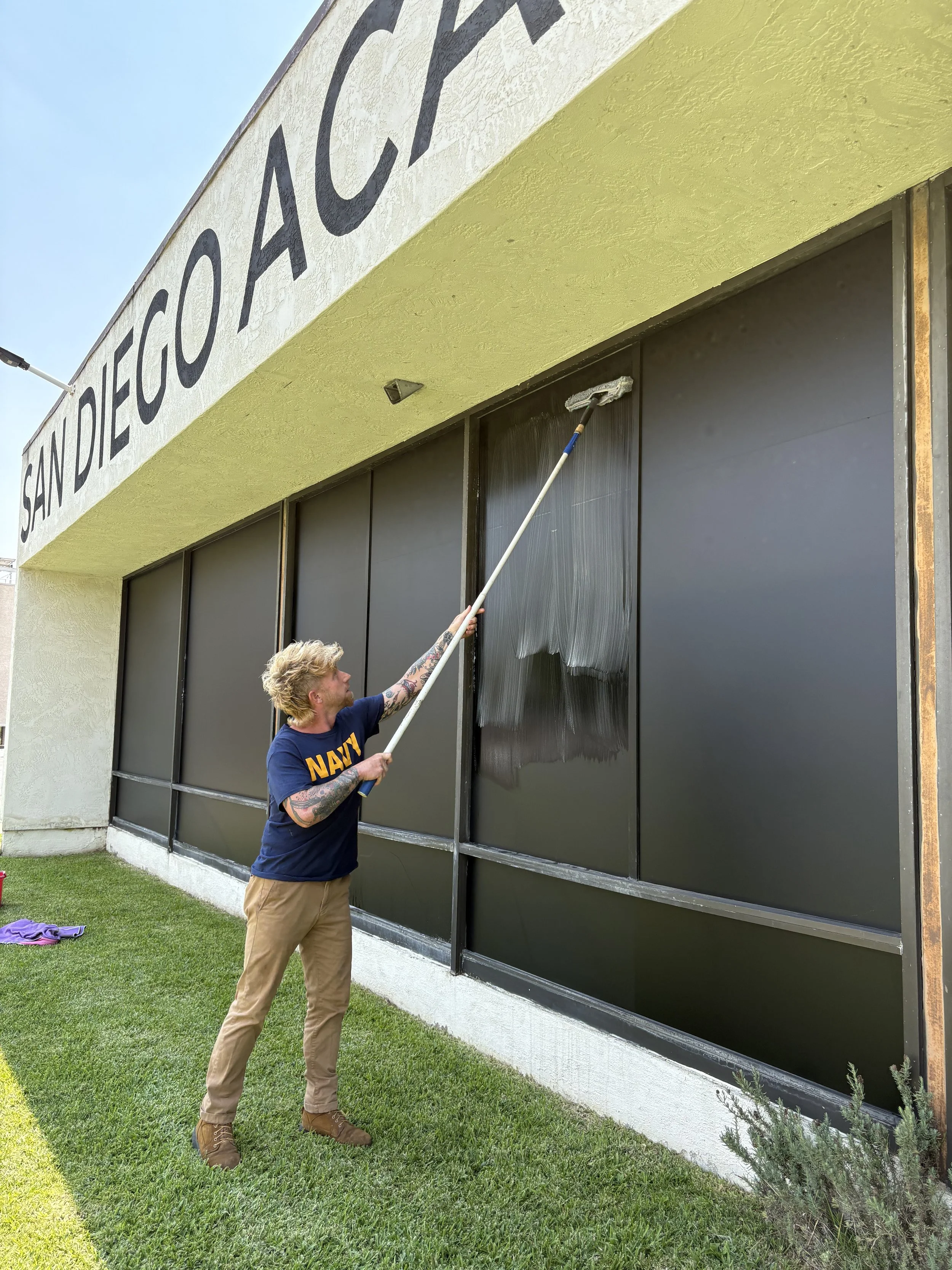 Connor and Bobby window cleaning the traditional way at Storyhouse Spirits in Downtown San Diego.